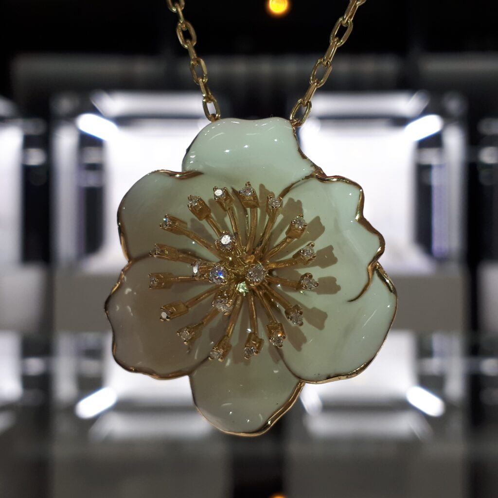 This mesmerizing pendant is made of 14 carat yellow gold. Decorated with white enamel from the front side and set with shiny diamonds it is a perfect companion for special occasions. If you are looking for a perfect gift this pendant will be the best choice. Wear this special piece from Roberto Bravo in combination with the other pieces from the White Dreams collection.