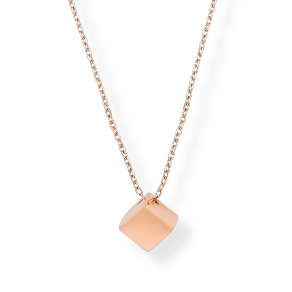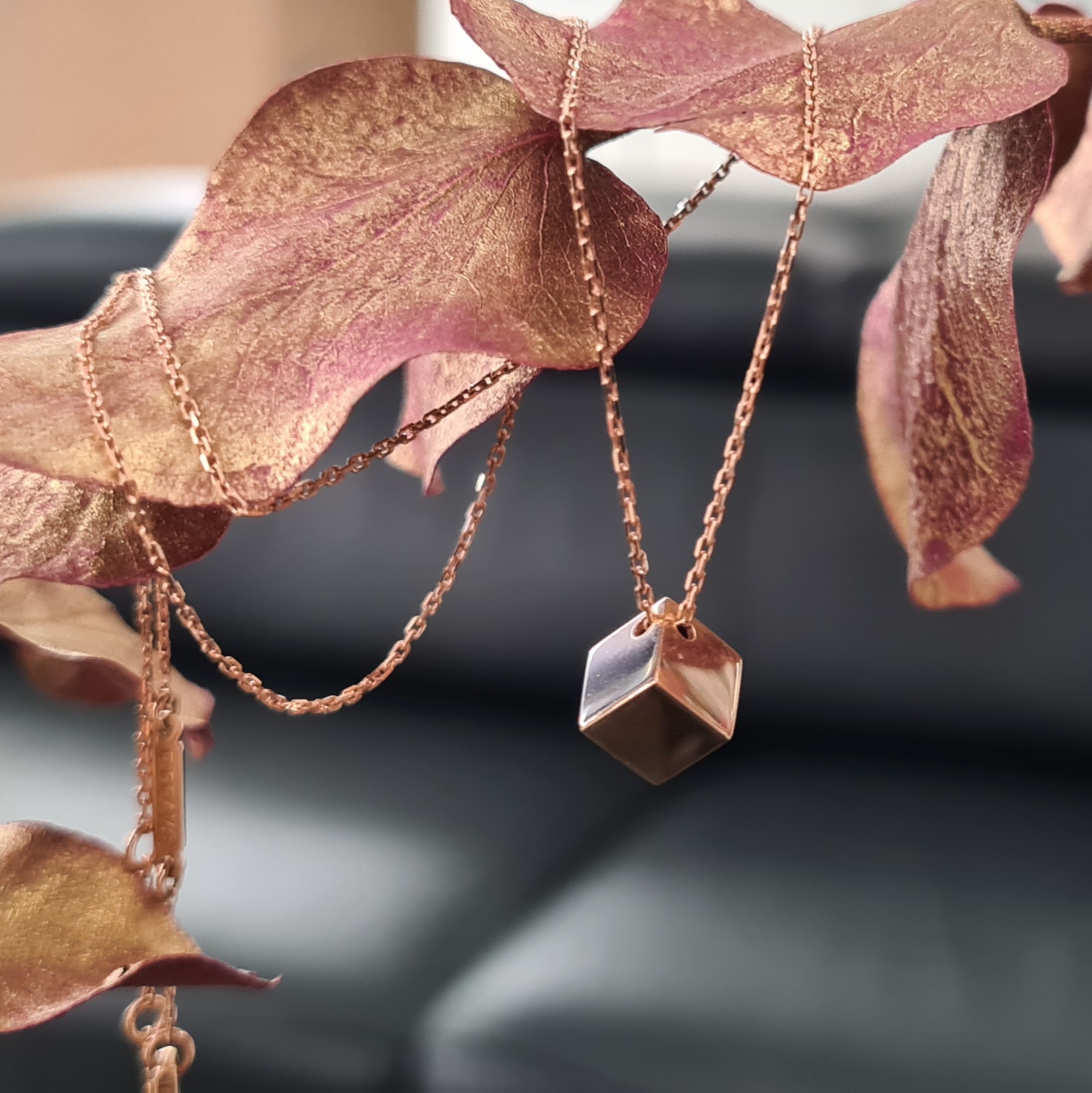 Vysoko lesklá úprava a geometrický dizajn dávajú tomuto šperku z ružového 14-karátového zlata zaujímavý vzhľad. Krátky náhrdelník má celkovú dĺžku 42cm, nosiť ho môžete tiež v dĺžke 40/41cm. Zdobí ho kocka 6x6x6mm. Kombinujte ho s ďalšími šperkami z kolekcie Qube.