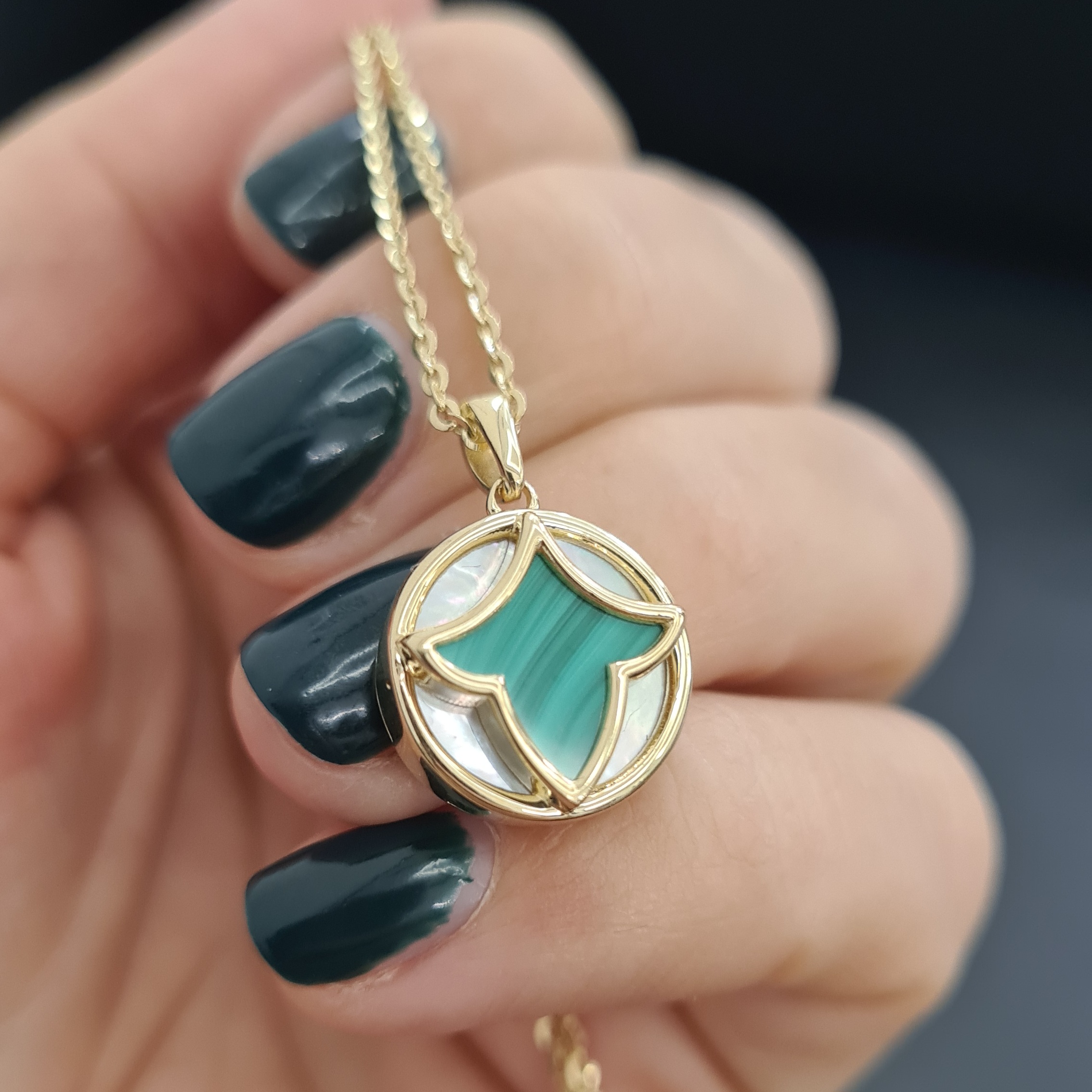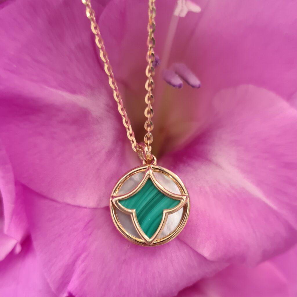 Elegantný náhrdelník z novej kolekcie Marrakech je zo žltého 14-karátového zlata. Zdobí ho malachit, biela perleť a lesklá úprava. Vďaka nastaviteľnej dĺžke vám dokonale sadne. Noste ho s ďalšími šperkami z kolekcie.