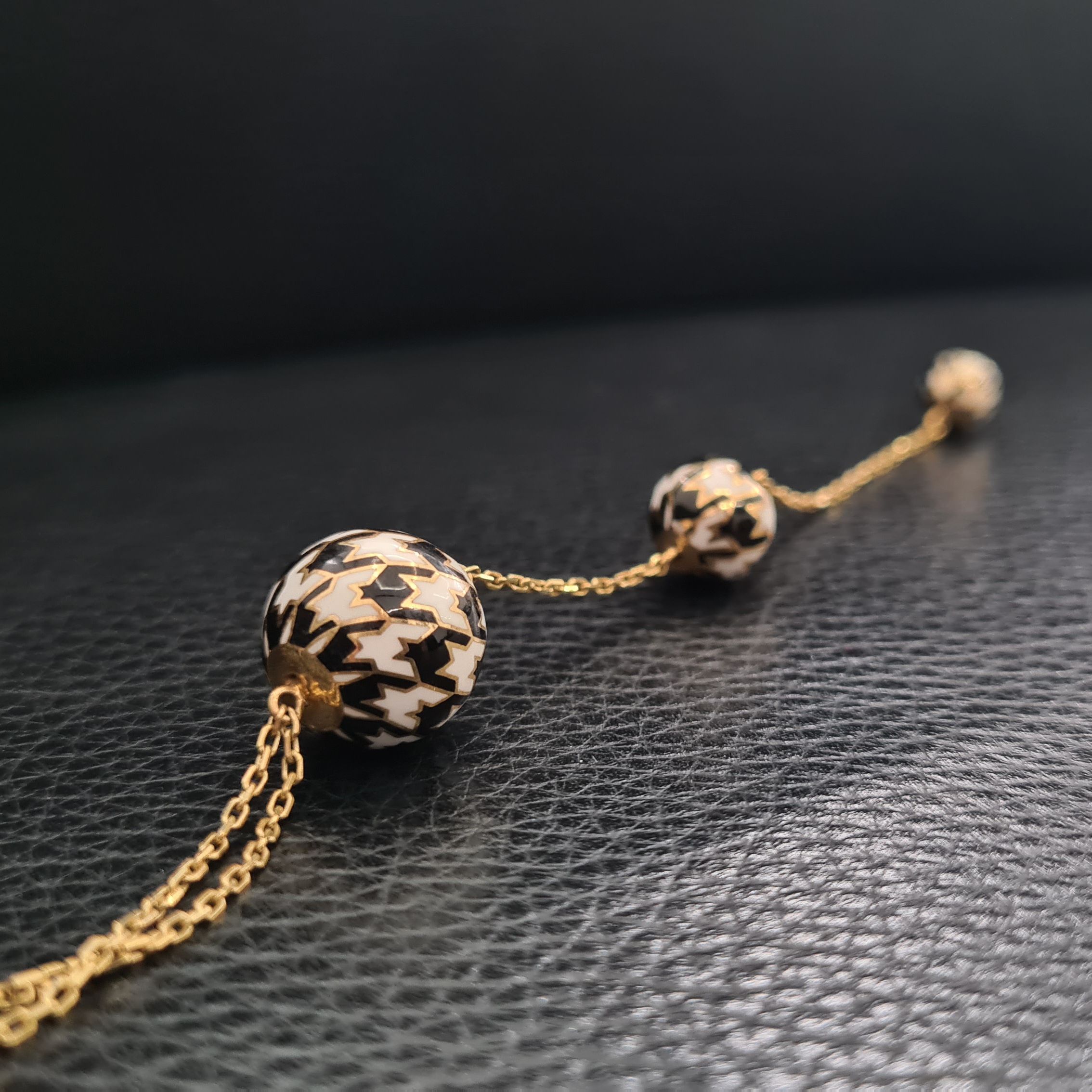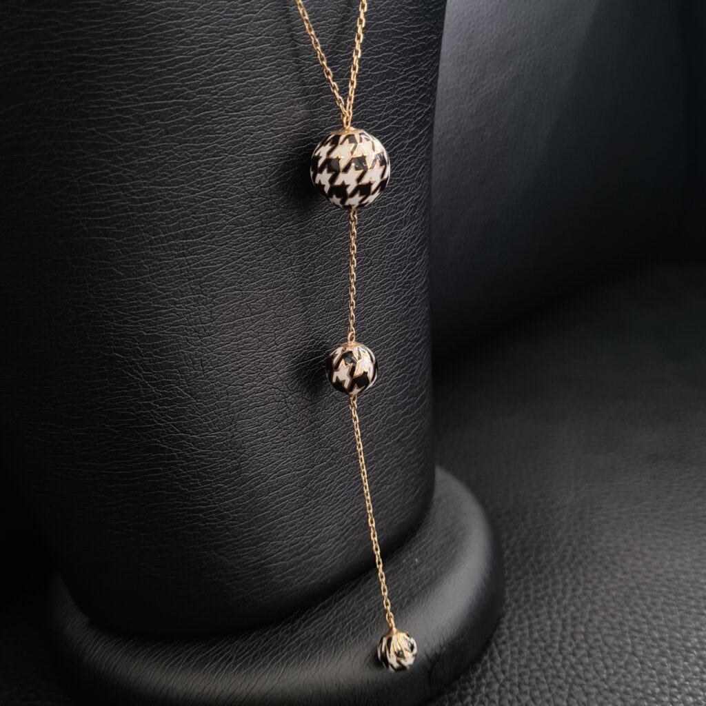 Náhrdelník je zo žltého 14-karátového zlata. Jeho celková dĺžka je 45cm plus 10cm prívesok, nosiť ho môžete nastavený v rozsahu 42 – 45cm. Zdobia ho tri guličky s úpravou enamelom čiernej a bielej farby, ktorú tvorí ikonický vzor kohútej stopy. Noste ho s ďalšími šperkami z kolekcie Pied de Poule.