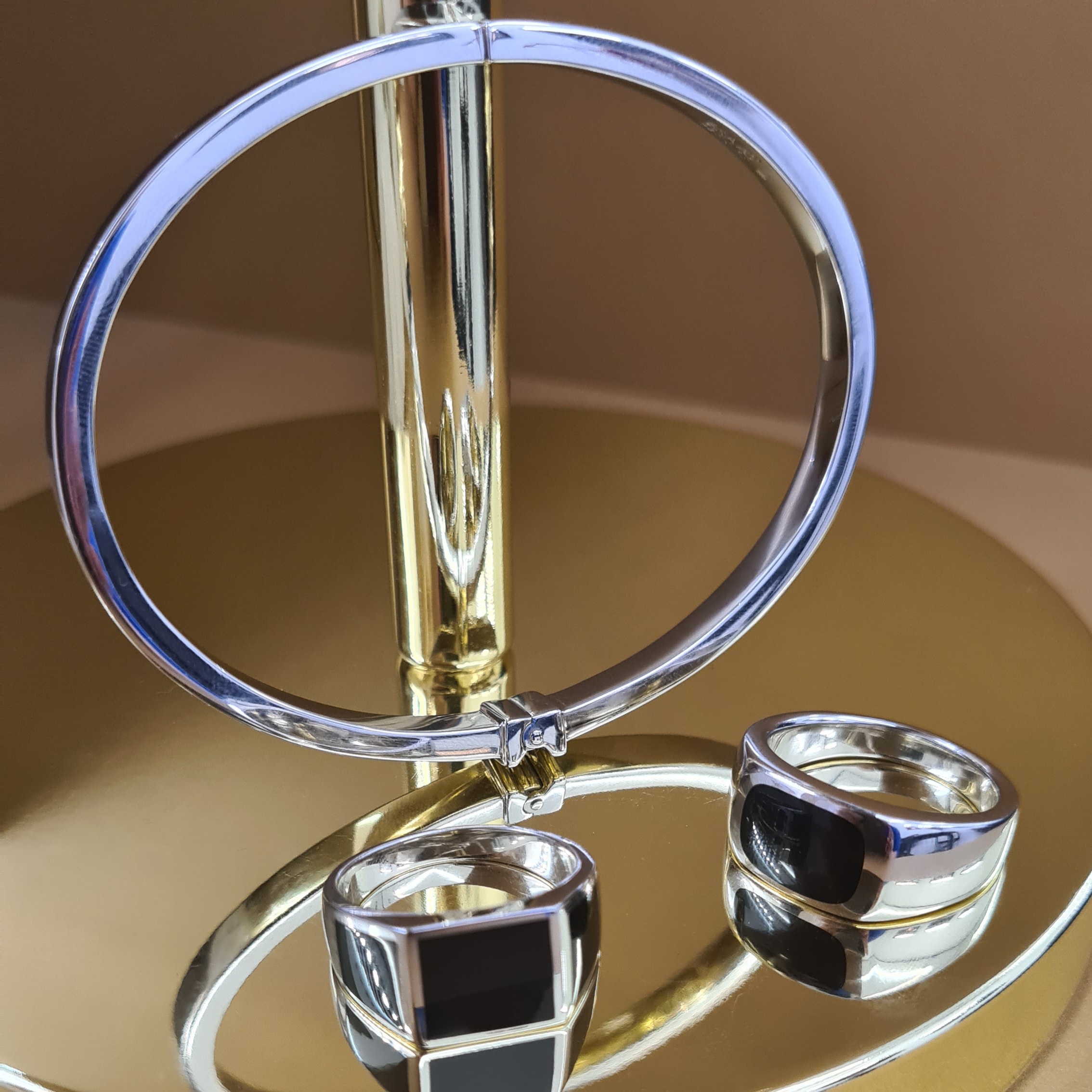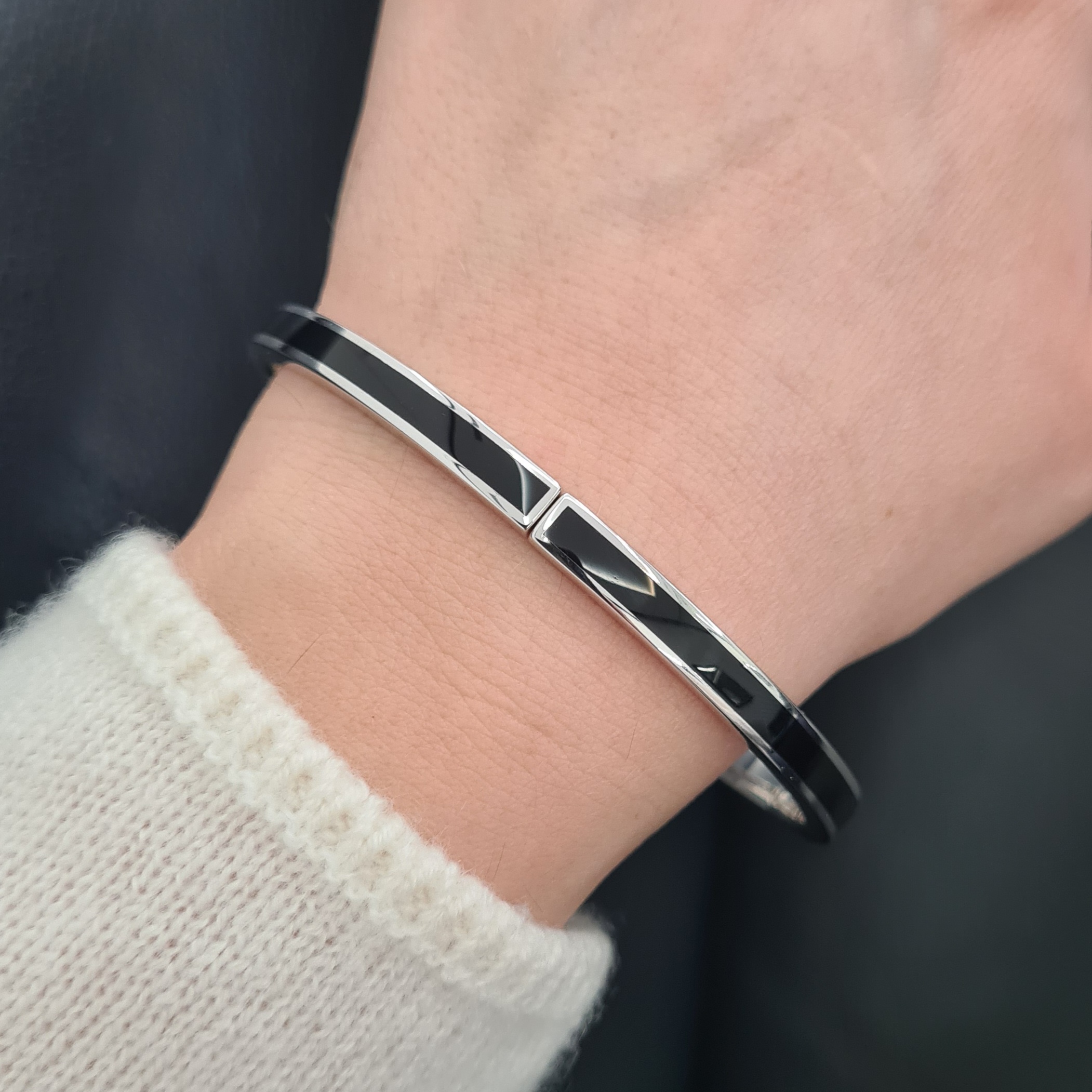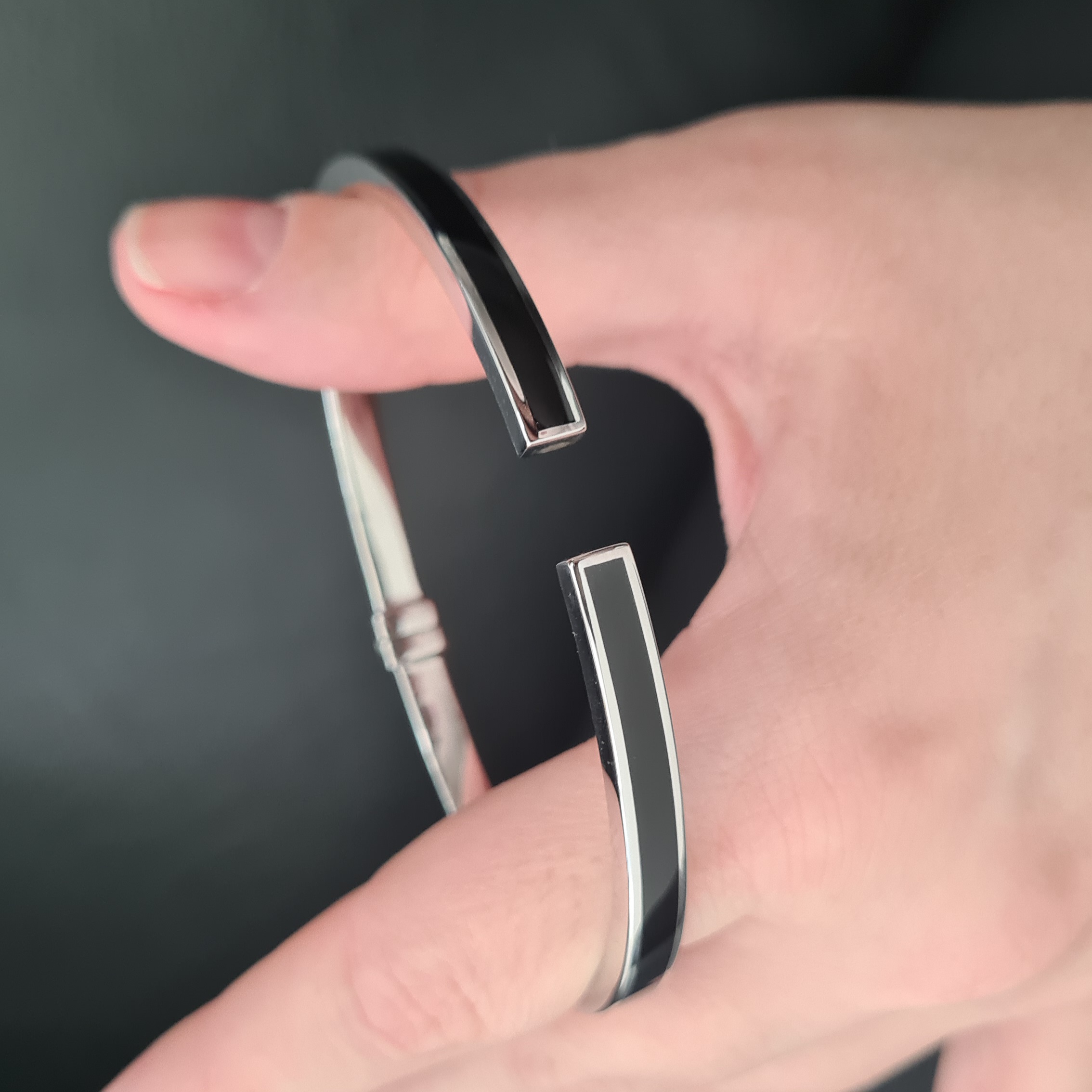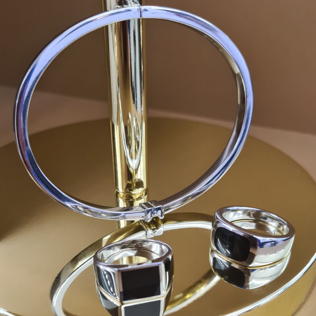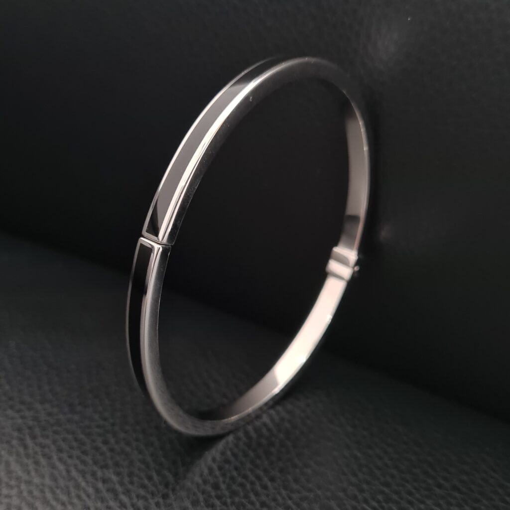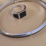 Masívny náramok vyrobený zo striebra z kolekcie Bravoman má rhodiovanú lesklú úpravu a zdobí ho elegantný čierny achát. Kombinujte ho s prsteňom z kolekcie.