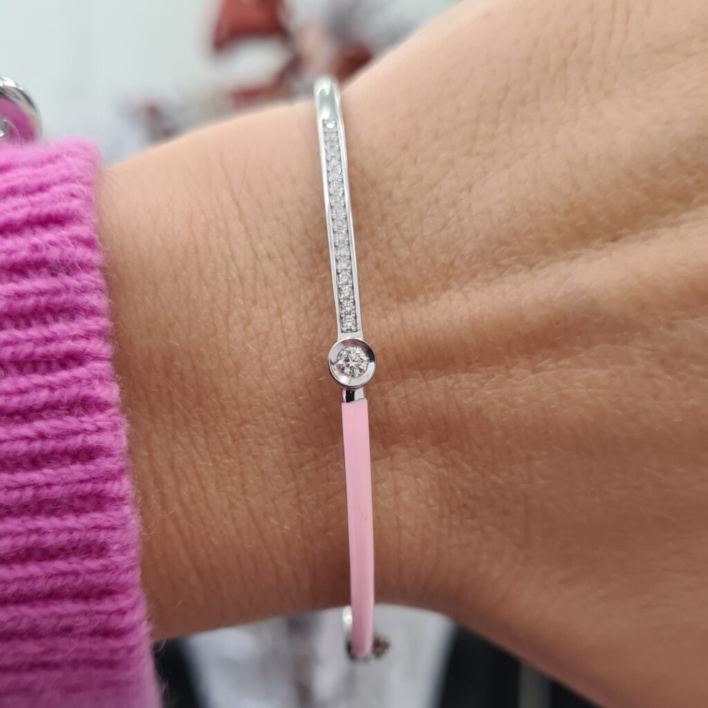 Elegantný pevný náramok z bieleho 14-karátového zlata s rhodiovanou úpravou je z novej kolekcie Neon. Zdobí ho enamel ružovej farb, diamant solitér v obrube a línia diamantov. Tento model je skvelým spoločníkom na každú príležitosť. Noste ho s ďalšími šperkami z kolekcie Neon alebo Chicky.