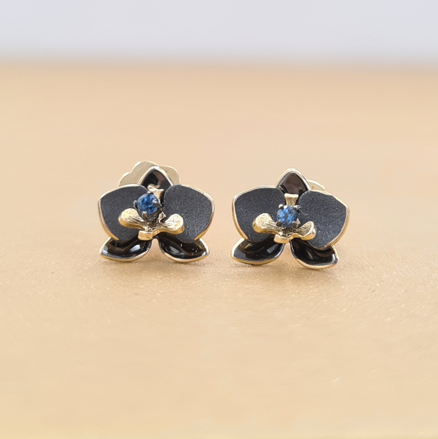 Napichovacie náušnice v tvare orchidey 8x7mm pôsobia mimoriadne romanticky. Sú zo žltého 14-karátového zlata s čiernou povrchovou úpravou enamelom. Dostupné sú vo vyhotovení s modrými topásmi london alebo ružovými zafírmi. Noste ich s ďalšími šperkami z kolekcie Black Orchid.