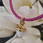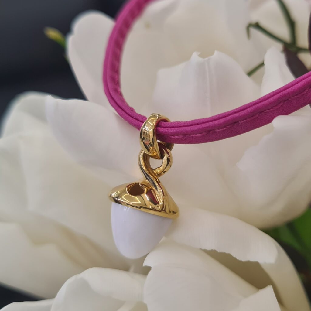 Prívesok z 18-karátového žltého zlata s bielym kacholongom s priemerom 11 mm kombinujte noste samostatne na retiazke z našej ponuky alebo na koženej šnúrke, ktorú dostanete k prívesku zdarma, prípadne ho kombinujte s ďalšími príveskami Mikado Bouquet a Flamenco. Uvedená cena je za prívesok bez retiazky.