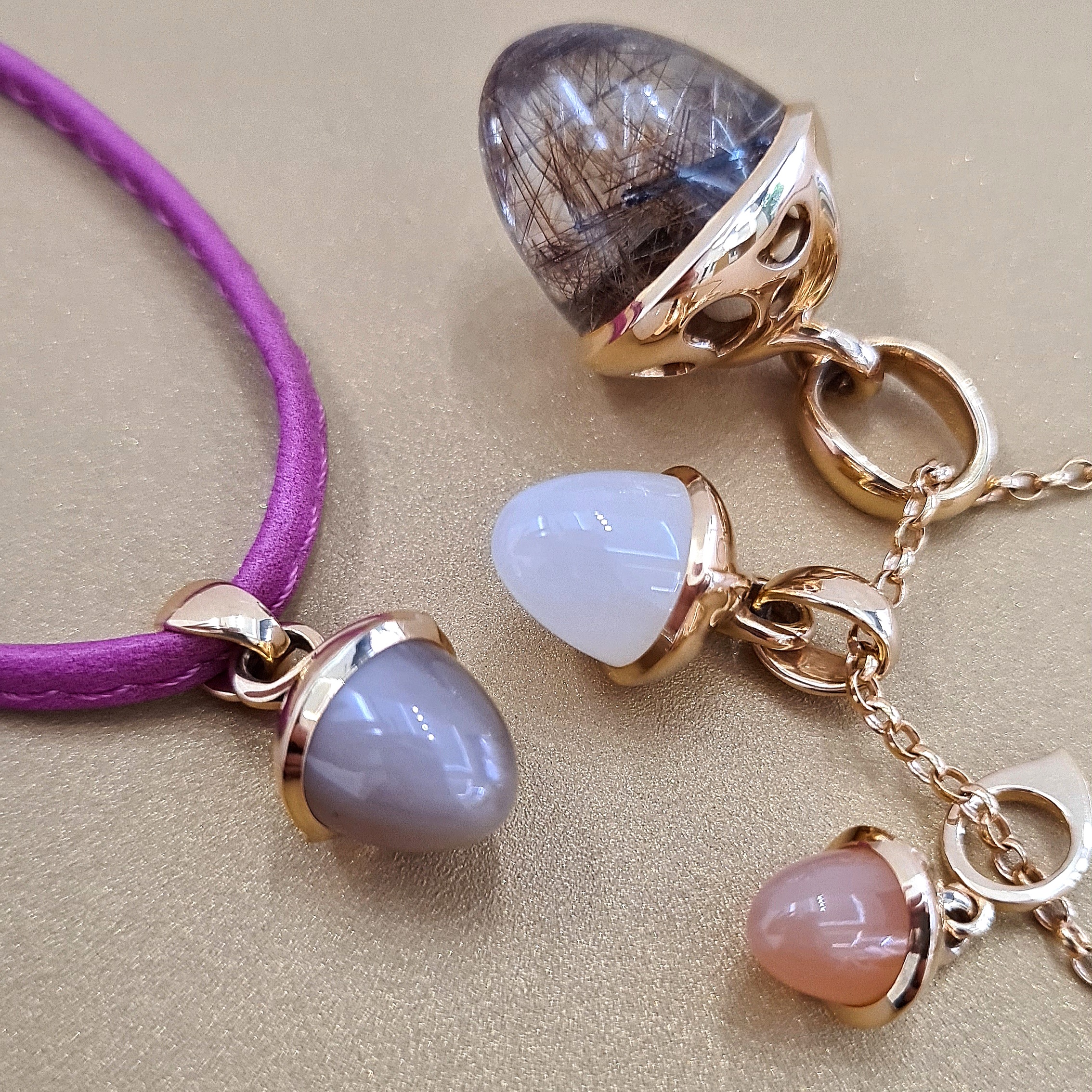 Elegantný prívesok z 18-karátového ružového zlata s hnedým mesačným kameňom s priemerom 11 mm noste samostatne na retiazke z našej ponuky alebo na koženej šnúrke, ktorú dostanete k prívesku zdarma, prípadne ho kombinujte s príveskami Mikado Flamenco. Uvedená cena je za prívesok bez retiazky.