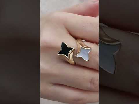 Elegantný prsteň s otvoreným dizajnom z novej kolekcie Marrakech je zo žltého 14-karátového zlata. Zdobí ho čierny onyx, biela perleť a lesklá úprava. Tento výrazný model pôsobí očarujúco. Noste ho s ďalšími šperkami z kolekcie.
