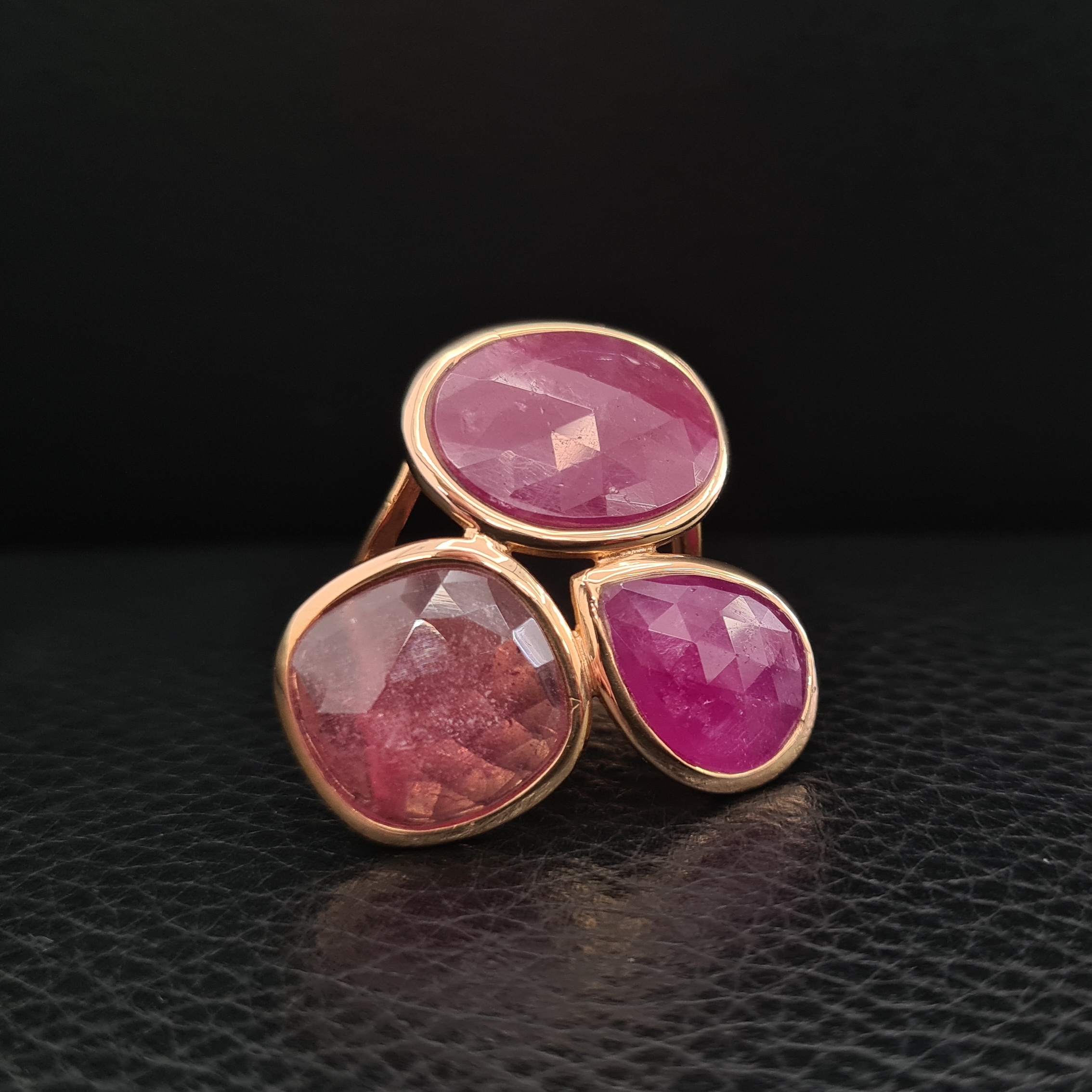 Tento výnimočný prsteň je vyrobený z ružového 18-karátového zlata. Zdobia ho tri prekrásne fazetované rubíny sýtej ružovej farby. S týmto modelom vás nikto neprehliadne. Venujte tento jedinečný prsteň k výročiu či jubileu.